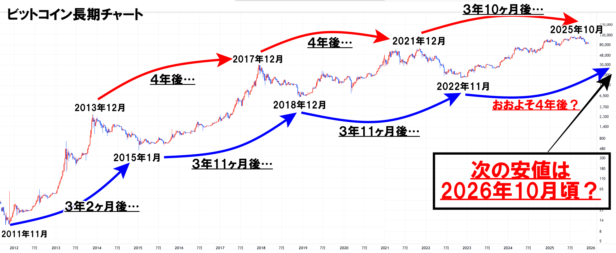 下の画像は、ビットコインの長期チャートですが、2013年12月4日に最初の高値が付いたあとに、その4年後である2017年12月17日に高値が付き、さらにその約4年後である2021年11月10日に高値、直近ではその3年10ヶ月後の2025年10月6日が付いています
