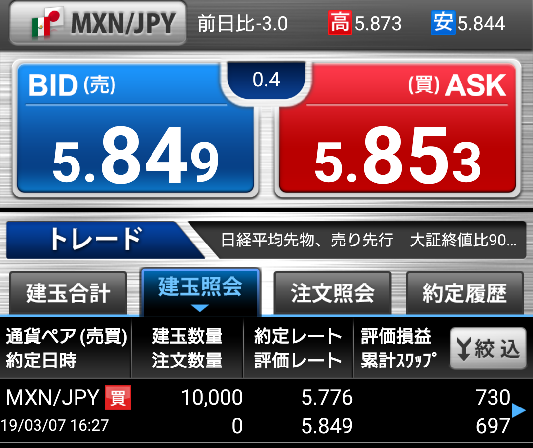 ですので現時点では最初に成り行き注文したメキシコペソ1万通貨のポジションしかありません