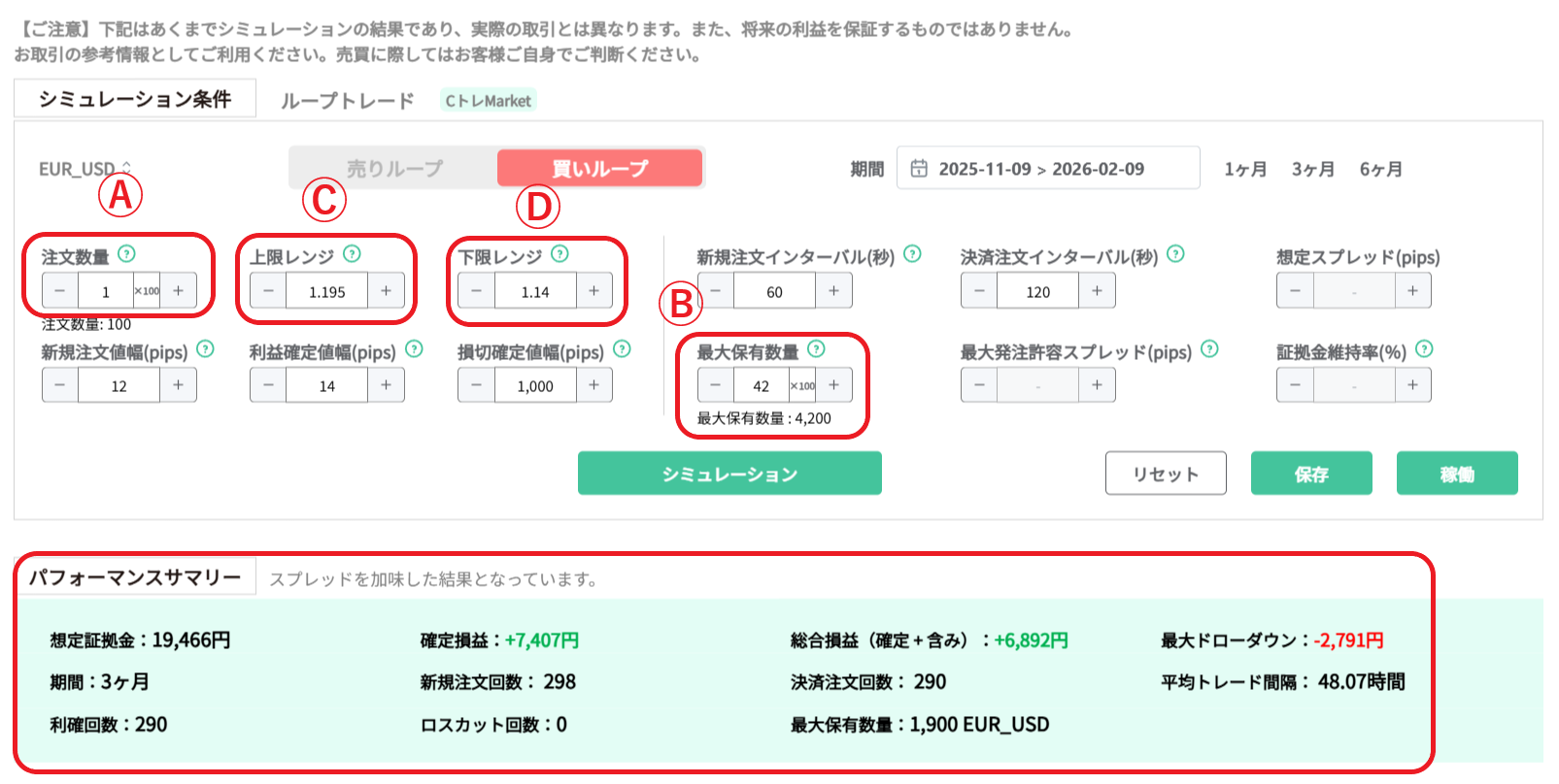 この設定値をベースに「Ⓐ注文数量」と「Ⓑ最大保有数量」、もしくは「Ⓒ上限レンジ」と「Ⓓ下限レンジ」を自分の資金額にあわせて調整していきます