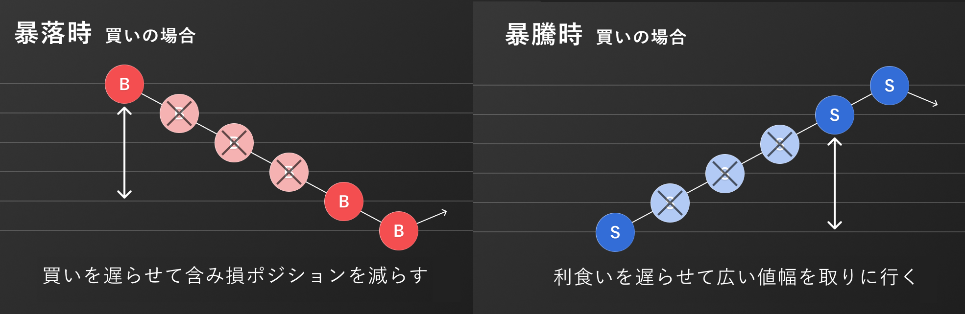 例えば、急変動の時にはどうしてもスプレッドが開いて自分の意図しない位置でポジションを持ったり、リピート系自動売買では急落時にたくさんのポジションをナンピンという形で持ってしまうことがあります。