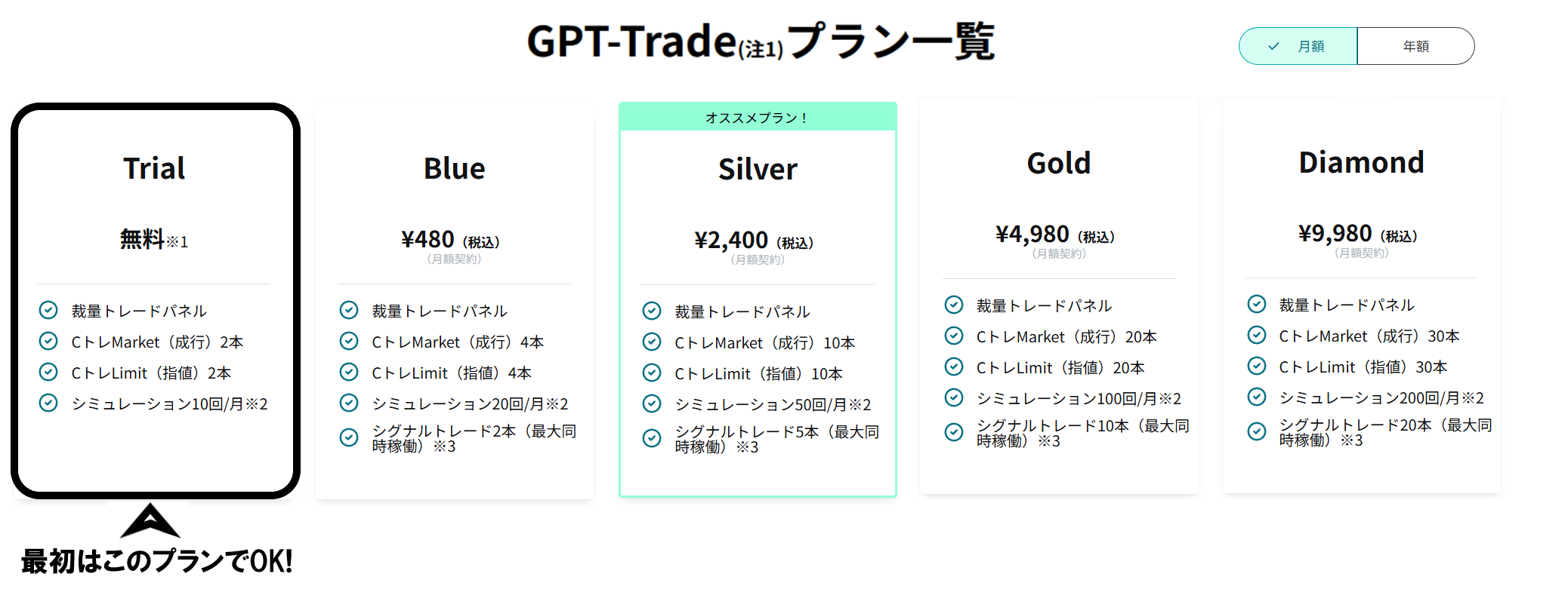 GPT-tradeでは、取引するCトレ(いわゆるリピート系やループトレードと言われるものの一種)プログラムの数やシミュレーションの回数によって月額のプラン料金が変わっていきます