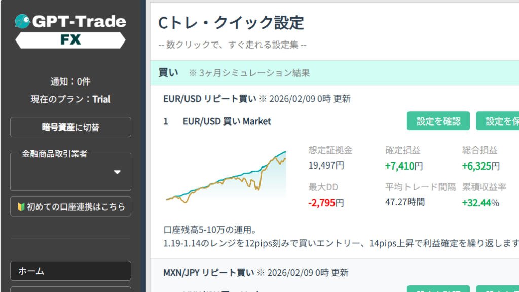 GPT-tradeのホーム画面には、いわゆる設定済みの「Cトレ・クイック設定」というのがあるので、これをベースに、自分の資金額に合わせてロット数の調整などを行っていきます
