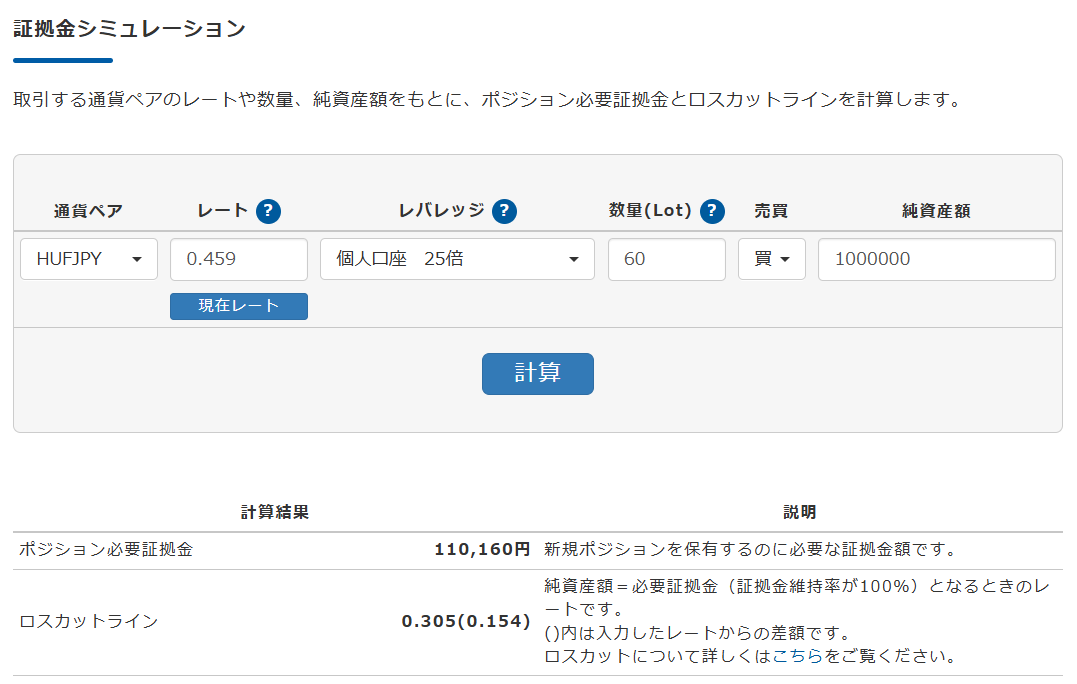 今のレートから100万円の資金でHUF/JPY(ハンガリーフォリント/円)を60Lot(600万通貨)を保有した場合は、0.305円まで下落した場合にロスカット決済(強制的に決済)されるため、歴代の最安値0.3110円まで耐えられることになります。