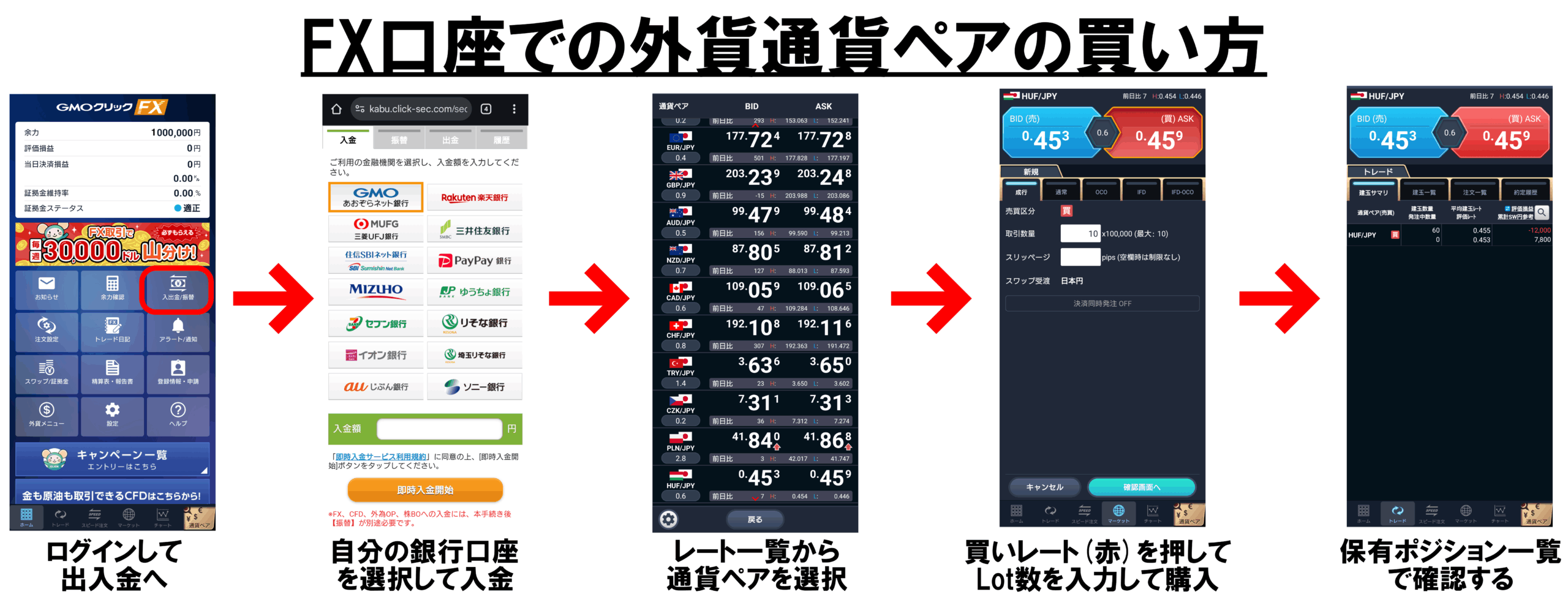 ここでは、FX口座で米ドルやハンガリーフォリントなどの外貨を買う方法を紹介します