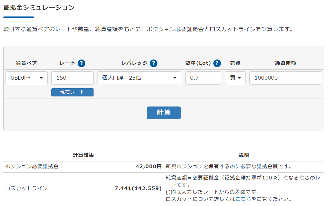 ・⇩証拠金シミュレーションで「レート」「レバレッジ倍率」「数量(1Lot=10,000通貨)」「売買」「純資金額」を入力すれば、ロスカットレート(強制的に決済されるレート)がわかります。