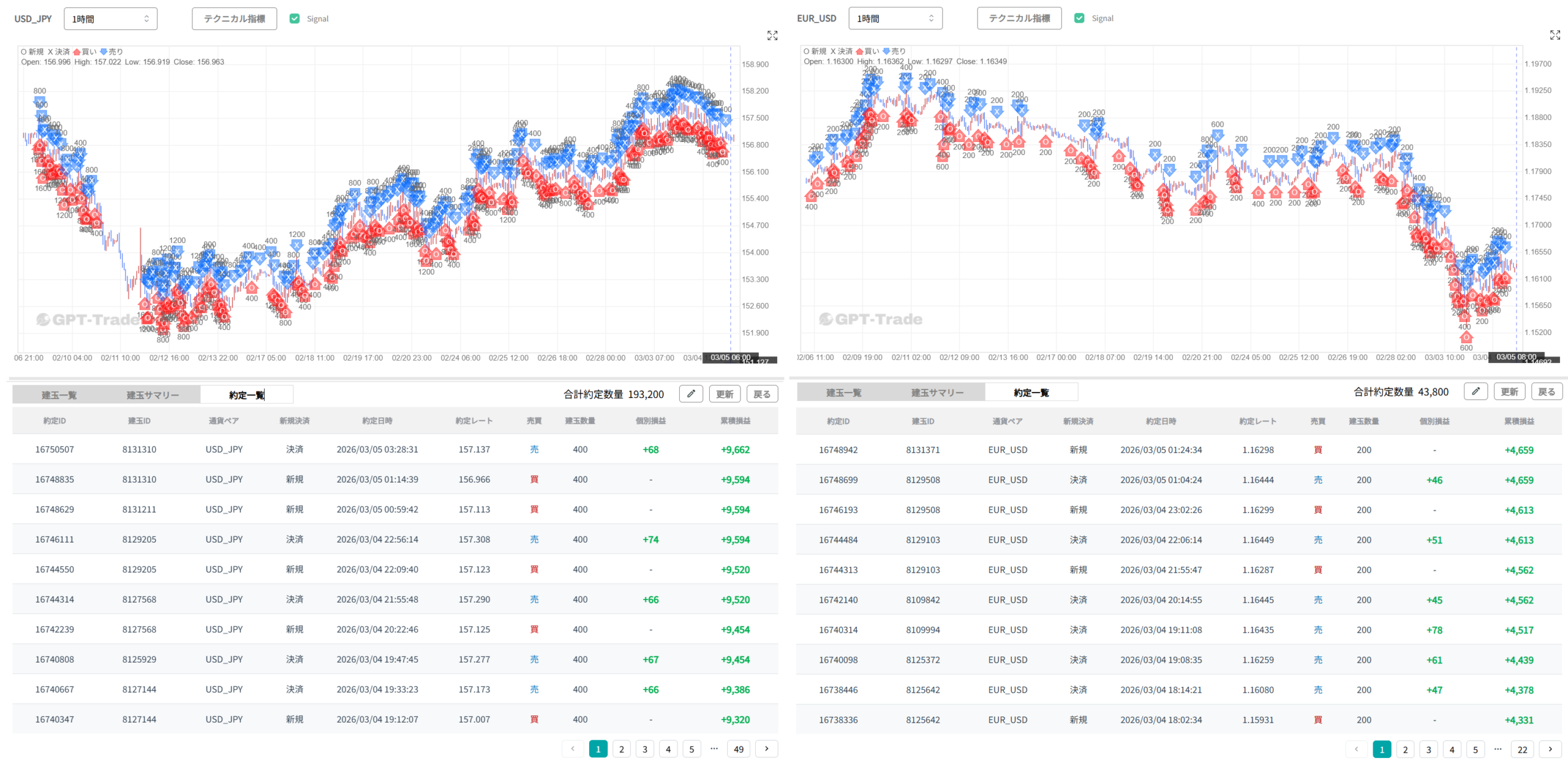 「〇」が新規約定、「✕」が決済注文となっていて、USD/JPY(ドル円)では483回約定、EUR/USD(ユーロドル)は219回の約定がされています。