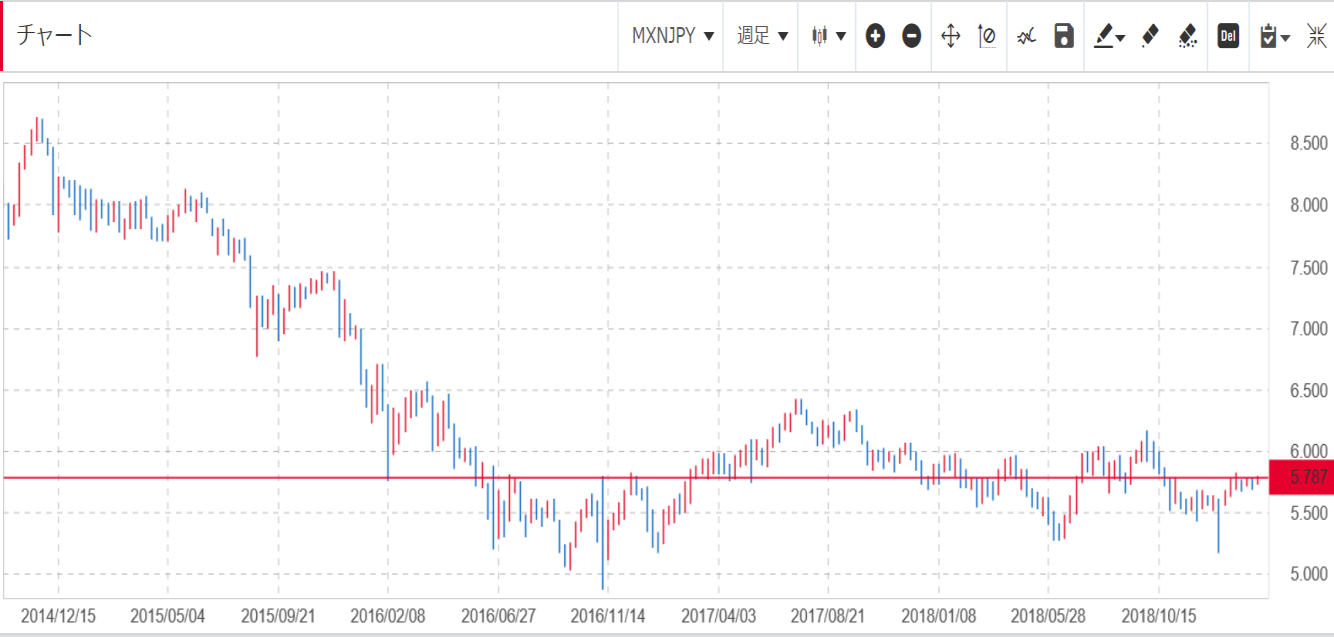メキシコペソ/円は2019年2月25日現在5.8円となっています