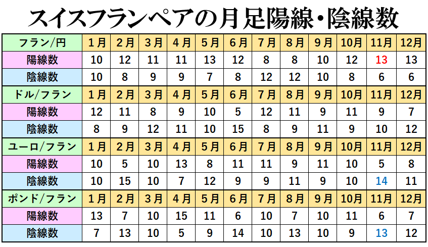 このように、フラン/円の陽線数が多い、ユーロ/フランとポンド/フランの陰線の数が多いということは、11月はスイスフラン買いになりやすい傾向があるといことが分かると思います