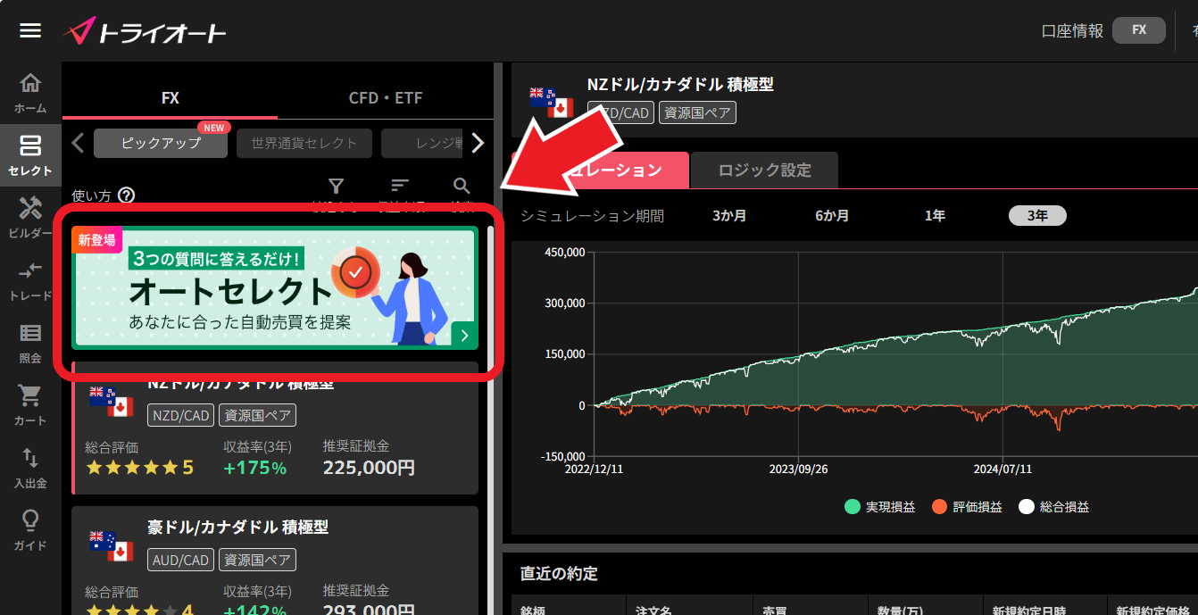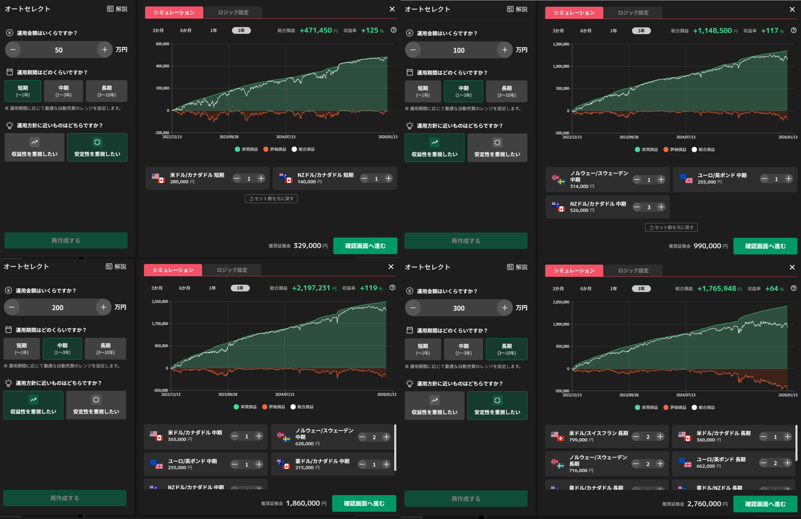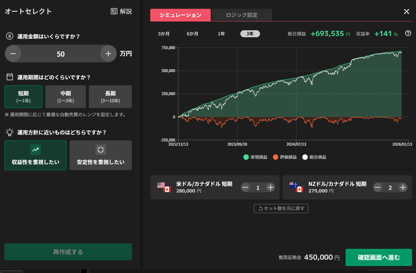 ⇧今回の、私が執筆した時点では、50万円の運用資金で運用期間「短期(~1年)」にすると、オートセレクトが過去3年間の収益率141%である、米ドル/カナダドルとNZドル/カナダドルの2つの自動売買を選択してくれます(※)