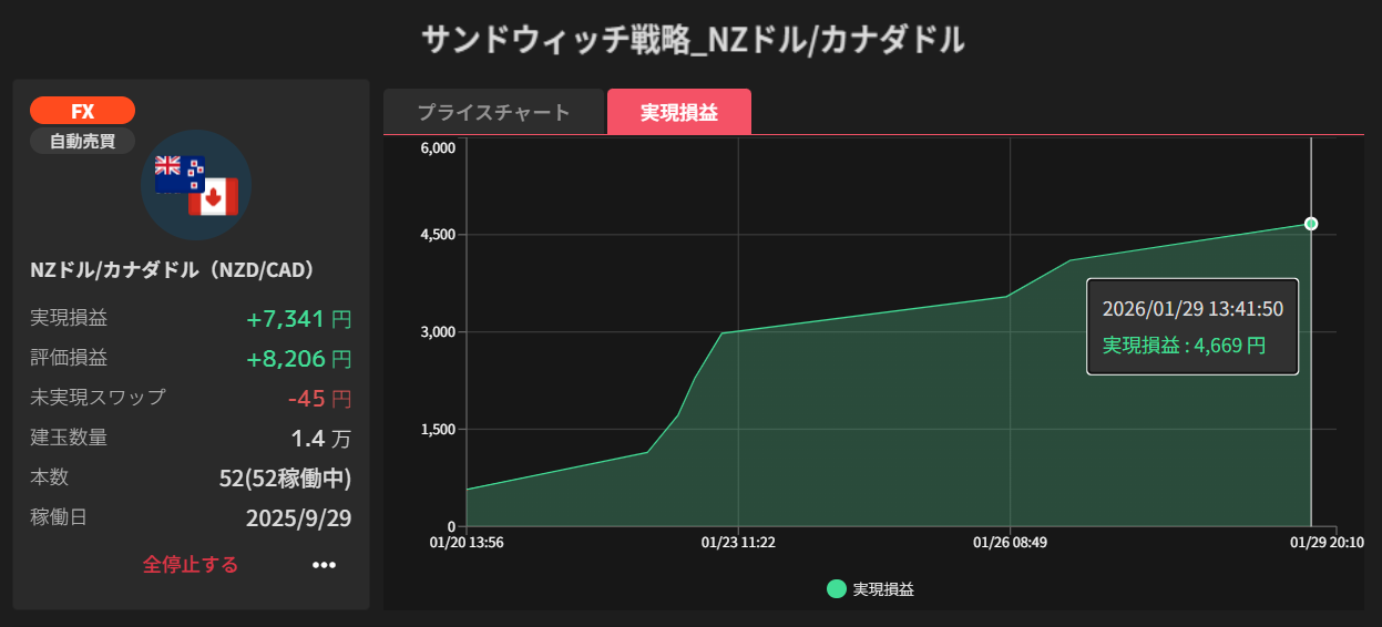 私は、このサンドウィッチ戦略の「NZドル/カナダドルVer.」をトライオートFXのビルダー機能を使って10月1日から30万円の資金でスタートしています